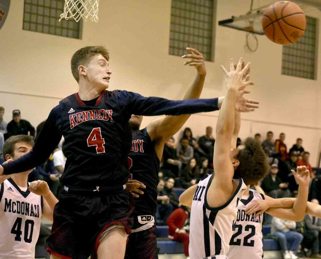 - Tribune Chronicle / Joe Simon John F. Kennedy’s Gianni Eaton (4) reaches for a rebound along with McDonald’s Parker Higgins, second from right, in the second half of their game Saturday in McDonald.