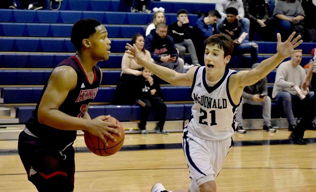 Tribune Chronicle / Joe Simon McDonald’s Dominick Carkido, right, pressures Kennedy’s Chris Williams Saturday during the Blue Devils’ 78-63 win at McDonald.
