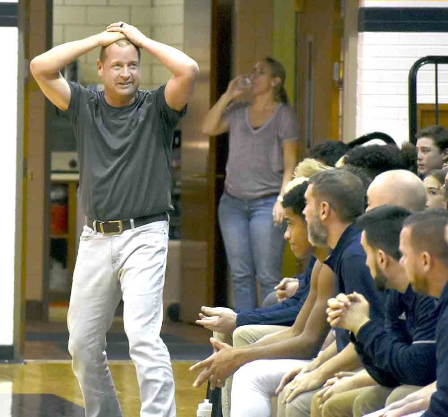 Tribune Chronicle / Joe Simon McDonald coach Jeff Rasile reacts to a play during the Blue Devils’ 78-63 victory over John F. Kennedy on Saturday in McDonald.