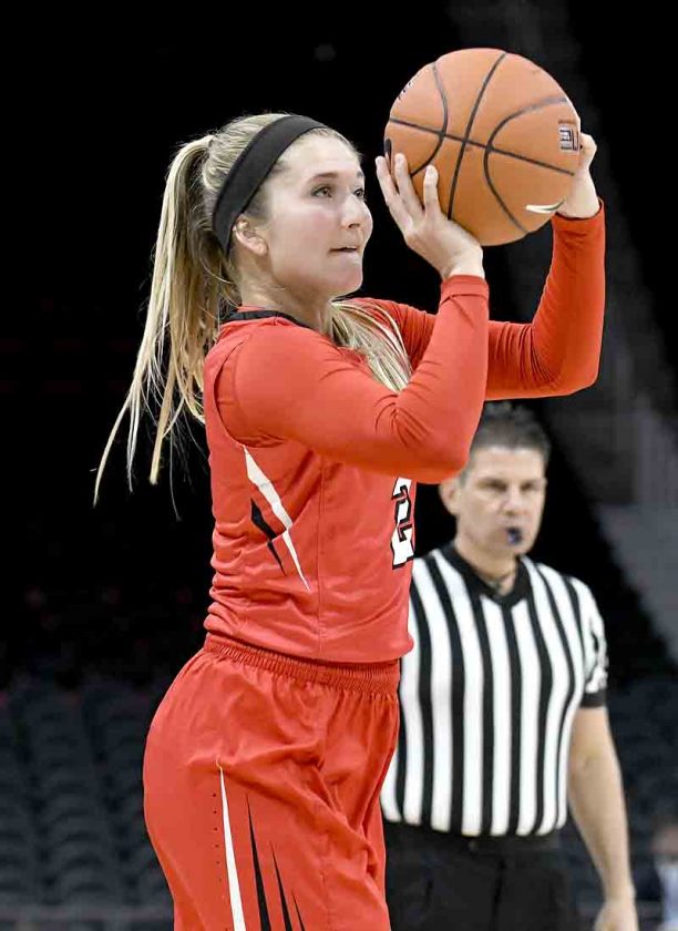Special to Tribune Chronicle / Robert Hayes YSU’s Alison Smolinski shoots a 3-pointer. She made five in the third quarter to rally the Penguins from a first-half, double-figure deficit. She had 15 of her game-high 18 in the third quarter.