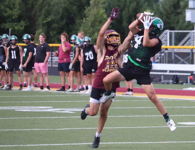 West Branch wide receiver Kayden Porter pulls in a catch during a 7-on-7 passing scrimmage against South Range earlier this summer.