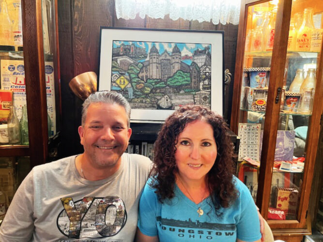 Bob and Priscilla Barko pose with Bob’s artwork depicting iconic markers of Youngstown State University. Bob graduated from the school in 1993 with an arts degree and, for the last 30 years, has painted the fire hydrants around campus to resemble Pete the Penguin, the university’s beloved mascot.