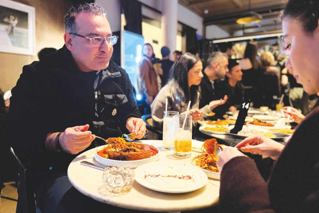 AP Kayvon Pourmirzaie and his wife, Behnaz Almazi, eat a tahdig-like pasta dish, based on a classic Iranian crispy rice dish, during a Persian pop-up dinner to celebrate Nowruz in New York on March 14.