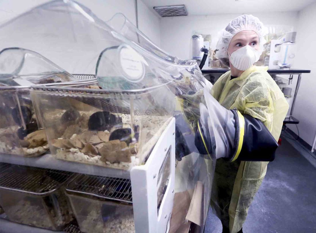 In this Feb. 28, 2017, photo, UW-Madison grad student Julia Kreznar tends mice housed as part of a microbiome study in the university's Microbial Sciences Building in Madison, Wis. (John Hart/Wisconsin State Journal via AP)