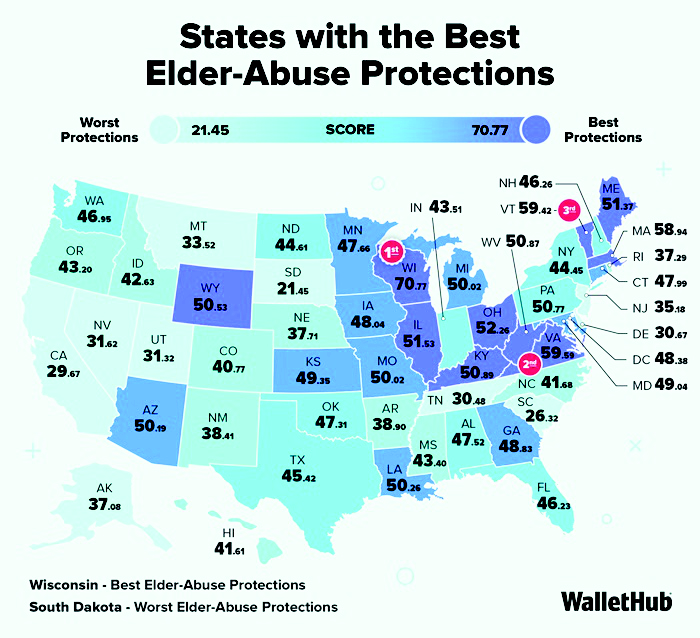 Wisconsin ranks as the top state for elder-abuse protections, and it’s one of only 22 states that have elder-abuse shelters, giving mistreated elderly residents resources for escaping their abusive situations. It