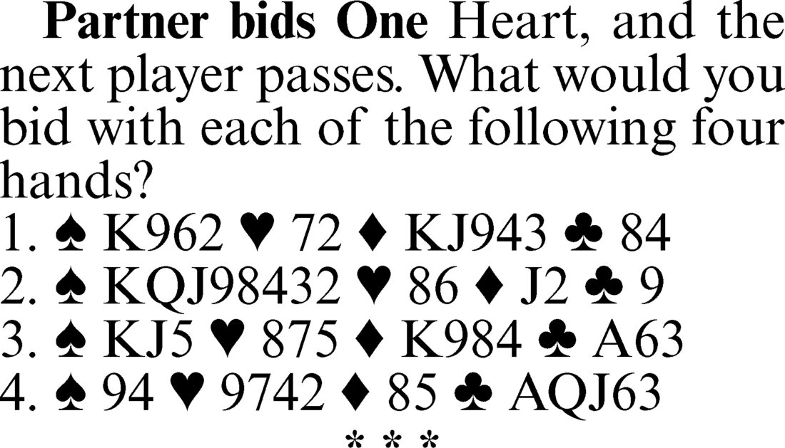4. Two hearts. It is far better to raise partner at once than to misrepresent your strength by responding with two clubs. The heart raise shows six to 10 points, which is exactly what you have. A two-club bid followed by a raise in hearts at your next turn would imply more in the way of points than you have — as in the preceding problem. Whenever possible, it is best to limit yourself to a specific point-count range at once and let partner carry on from there.