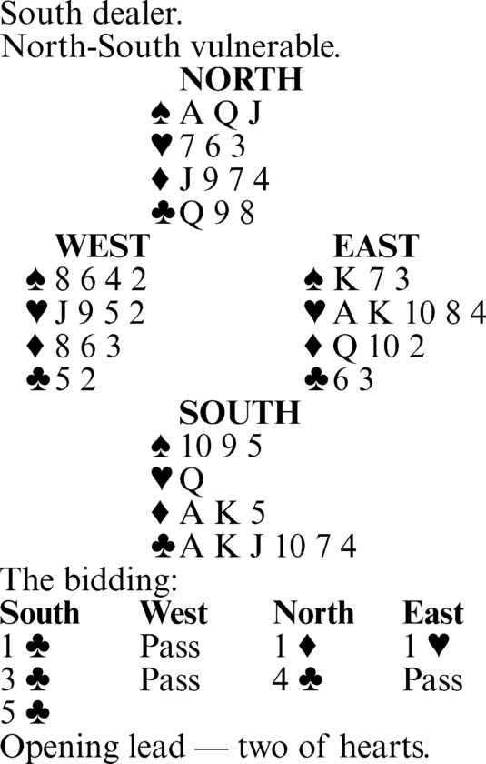 Consider this deal where West leads a heart against five clubs. East takes the king and continues with the ace, ruffed by South. Declarer may still lose a spade and a diamond, and if he loses both, he goes down one.