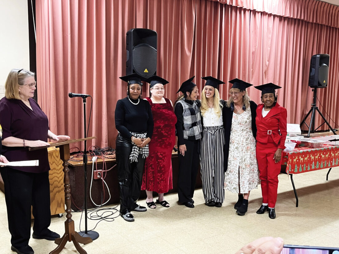 Staff photos / Bob Coupland Sherry Steiner, a program facilitator for Thrive 10:10’s “Getting Ahead in a Just Gettin By World,” left, speaks at a recent graduation for those who completed the 18-week program. Graduates include, from left, Dierdre Goliday, Skylar Davis, Nichole Allen, Ashley Ozias, Kristena Pivovar and Tammie Riddle.