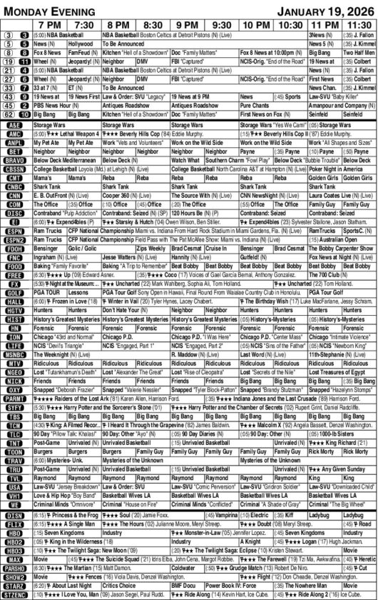 TV listing: Monday, Jan. 19, 2026