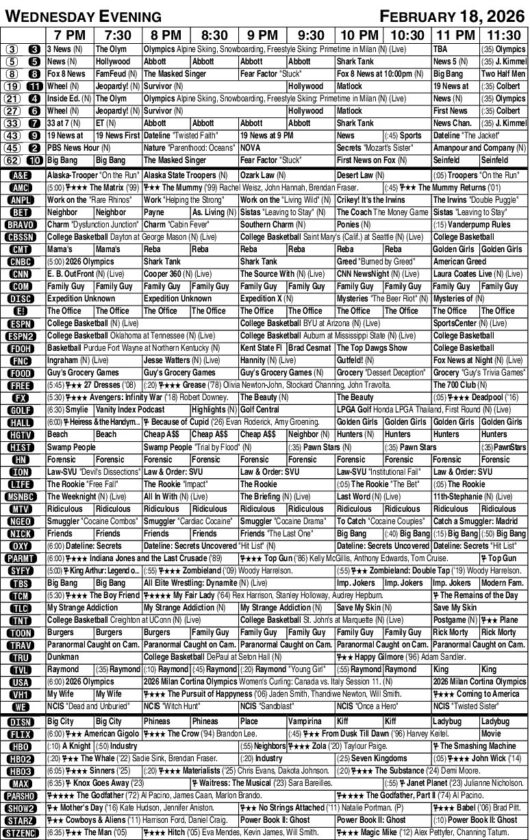 Wednesday evening TV listings