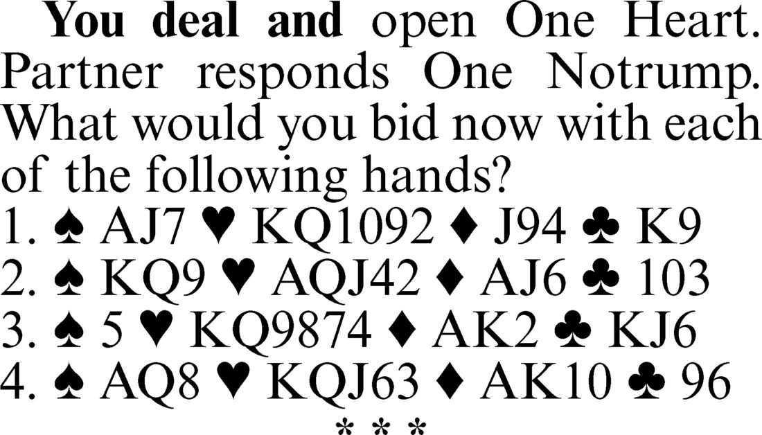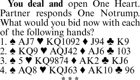 3. Three hearts. This is also an invitational bid, but here the emphasis is on suit play rather than notrump. Partner should pass three hearts if he is in the lower end of the range for his notrump response. If he does pass, you are unlikely to miss a game.