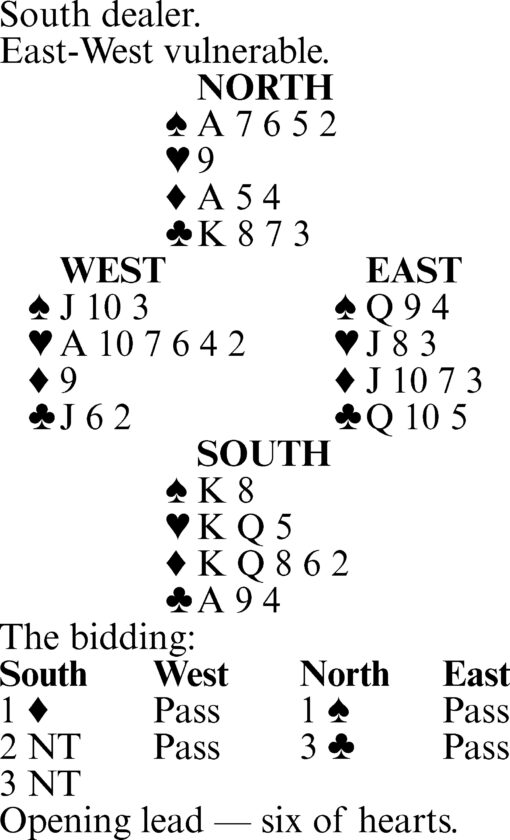 Before tackling the diamonds, South should count his tricks and realize that he doesn’t need to score five diamond tricks to make his game. With eight tricks already assured and only one more needed, he can afford to lose a diamond, provided East is not permitted to gain the lead for a potentially killing heart return.