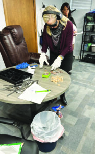 Submitted photos Dementia Live participant Diane Siskowic-Jurkovic tries to work with a puzzle while in full gear at Cornerstone Caregiving in Austintown. Sharon Queener of Ohio Living Home Health & Hospice observes and takes notes.