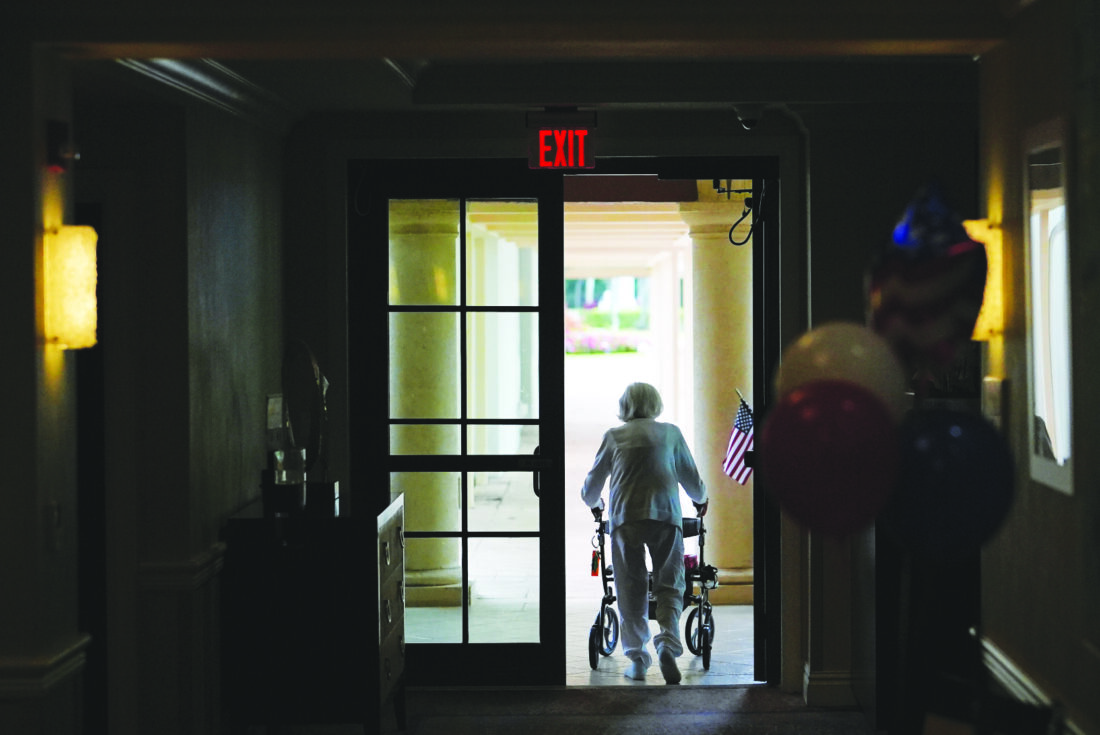 FILE - A woman uses a walker as she exits an assisted living building, July 4, 2025, in Boca Raton, Fla. (AP Photo/Rebecca Blackwell, File)