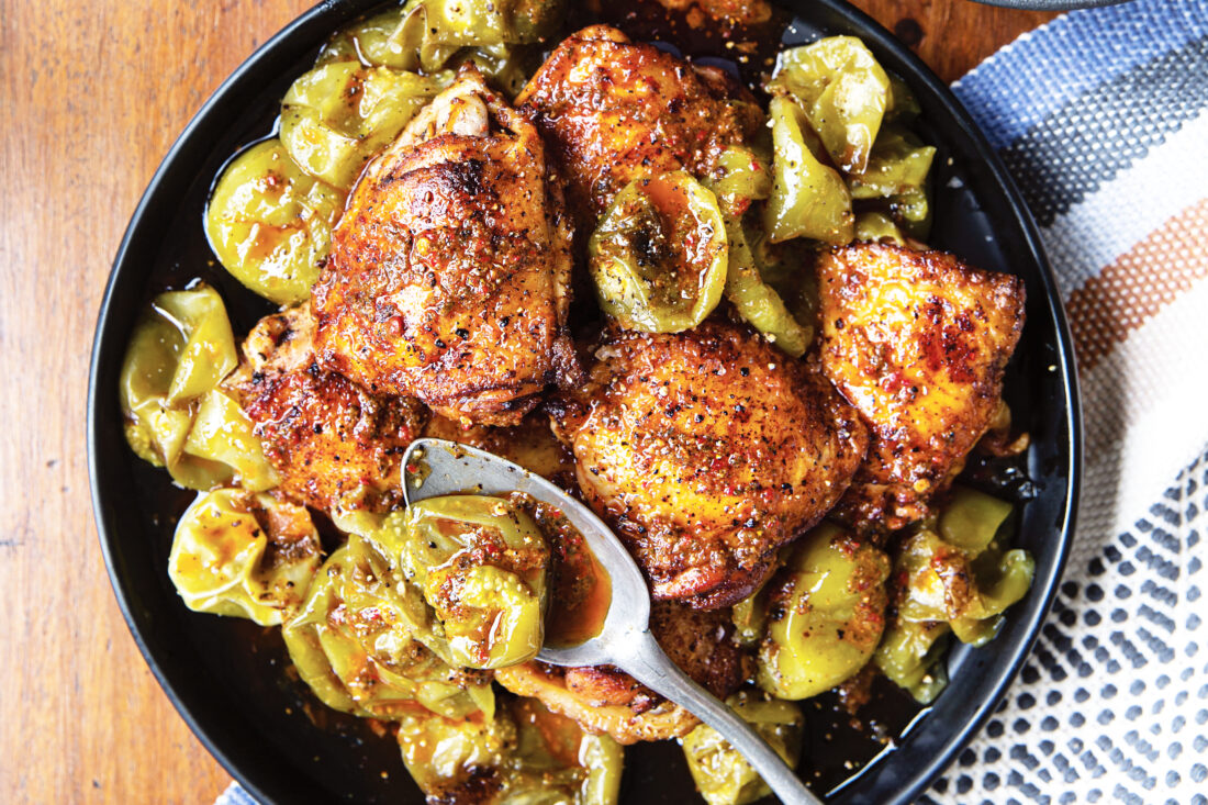 Heat a large cast-iron skillet over high heat. Remove the thighs from their bag, shaking off as much of the marinade as possible. Add all the thighs to the skillet, skin side down, and cook until browned, about 12 minutes. It’s important that the thighs are snug as a bug as they will create steam and moisture and won’t brown too much. Transfer the skillet to the oven and continue to cook, skin side down, 7 minutes longer. Remove the skillet from the oven and carefully flip the chicken skin side up. Return the skillet to the oven and continue to cook for 10 minutes, or until fully cooked.