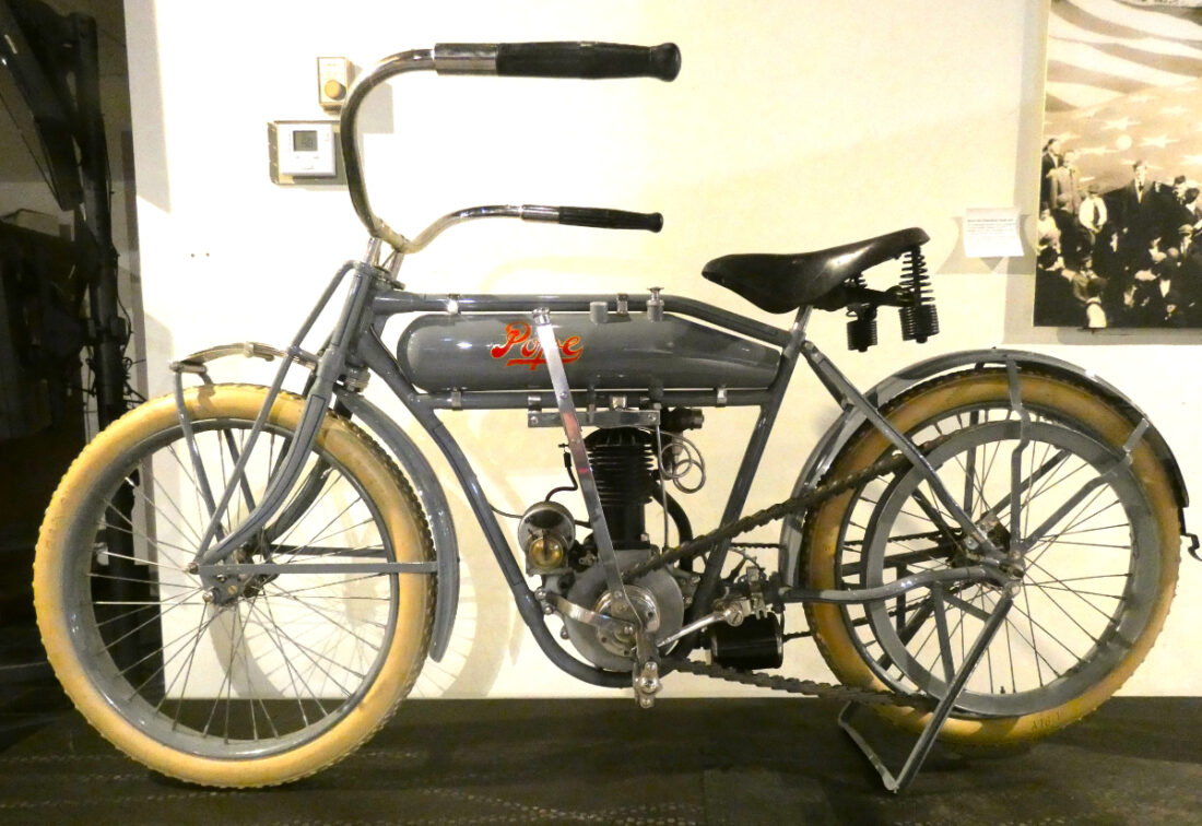 Staff photo / Andy Gray This 1909 Pope is the oldest vehicle in the 26th Motorcycle Exhibit — “My First Bike” at the National Packard Museum, 1899 Mahoning Ave. NW, Warren. The annual show runs through May 30. For more information, go to packardmuseum.org or call 330-394-1899.