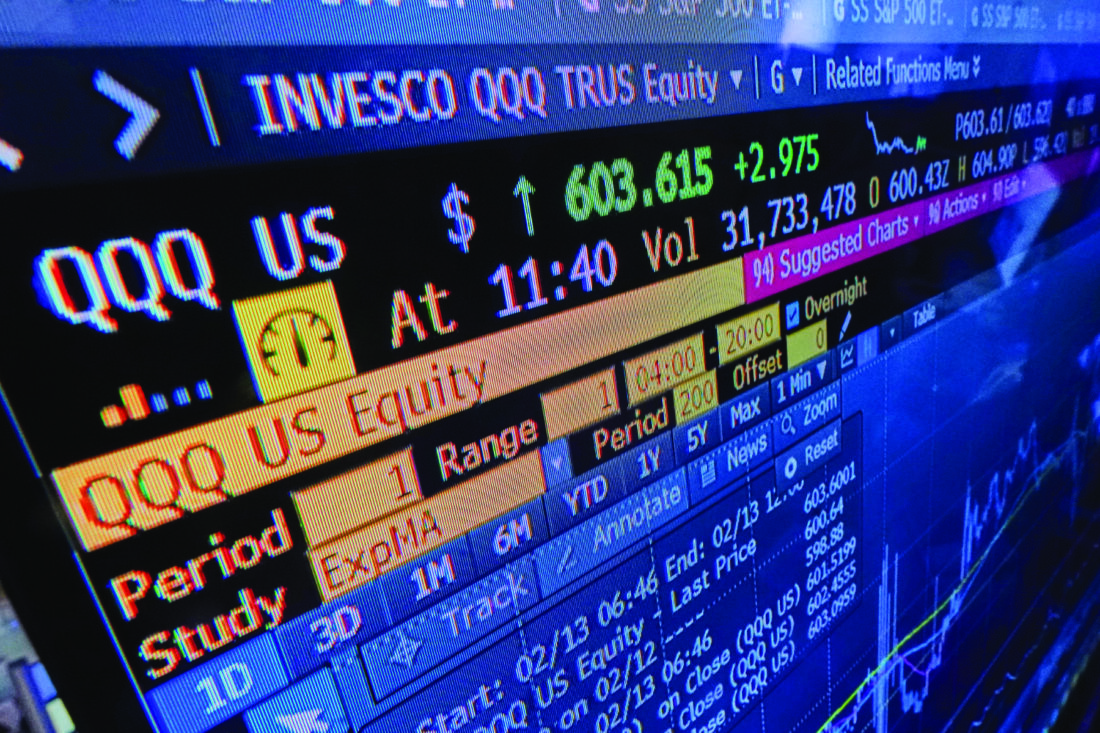 A screen on the floor of the New York Stock Exchange displays an intraday number for the QQQ, tracking the Nasdaq-100, Friday, Feb. 13, 2026. (AP Photo/Richard Drew)