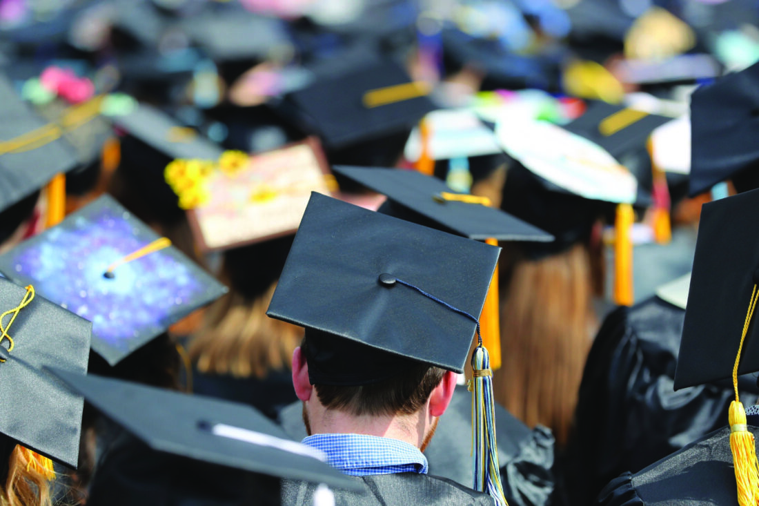 FILE - In this May 5, 2018, file photo, graduates at the University of Toledo commencement ceremony in Toledo, Ohio. (AP Photo/Carlos Osorio, File)