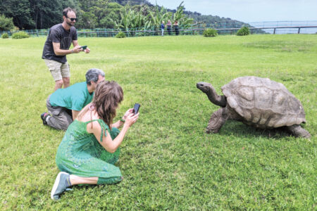 AP Tourists take photos of Jonathan, a then 192-year-old tortoise, on the lawn of Plantation House in Jamestown on the South Atlantic island of St. Helena on Feb. 22, 2024.