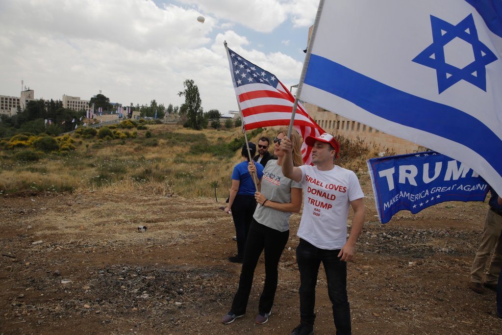 Israelis hold American and Israeli flags with the new U.S. embassy in the background in Jerusalem, Monday, May 14, 2018. Israel prepared for the festive inauguration of a new U.S. Embassy in contested Jerusalem. (AP Photo/Sebastian Scheiner)