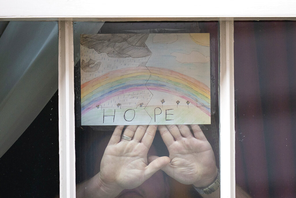 A drawing of a rainbow with the word "Hope" by Logan age 6 is displayed in one of the windows of 10 Downing Street, London as Prime Minister Boris Johnson remains in hospital today following his admission on Sunday with continuing coronavirus symptoms. The highly contagious COVID-19 coronavirus has impacted on nations around the globe, many imposing self isolation and exercising social distancing when people move from their homes. (Aaron Chown/PA via AP)