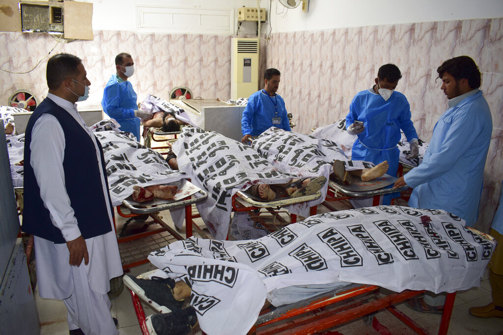 Pakistani paramedical personnel stand next to the covered bodies of suspect militants who were killed by security forces today at a morgue in Quetta, Pakistan. Pakistan's counter-terrorism units raided a hideout of the Islamic State group in the restive southwestern Baluchistan province before dawn, setting off a shootout that killed some 11 militants, the police said. (AP Photo/Arshad Butt)