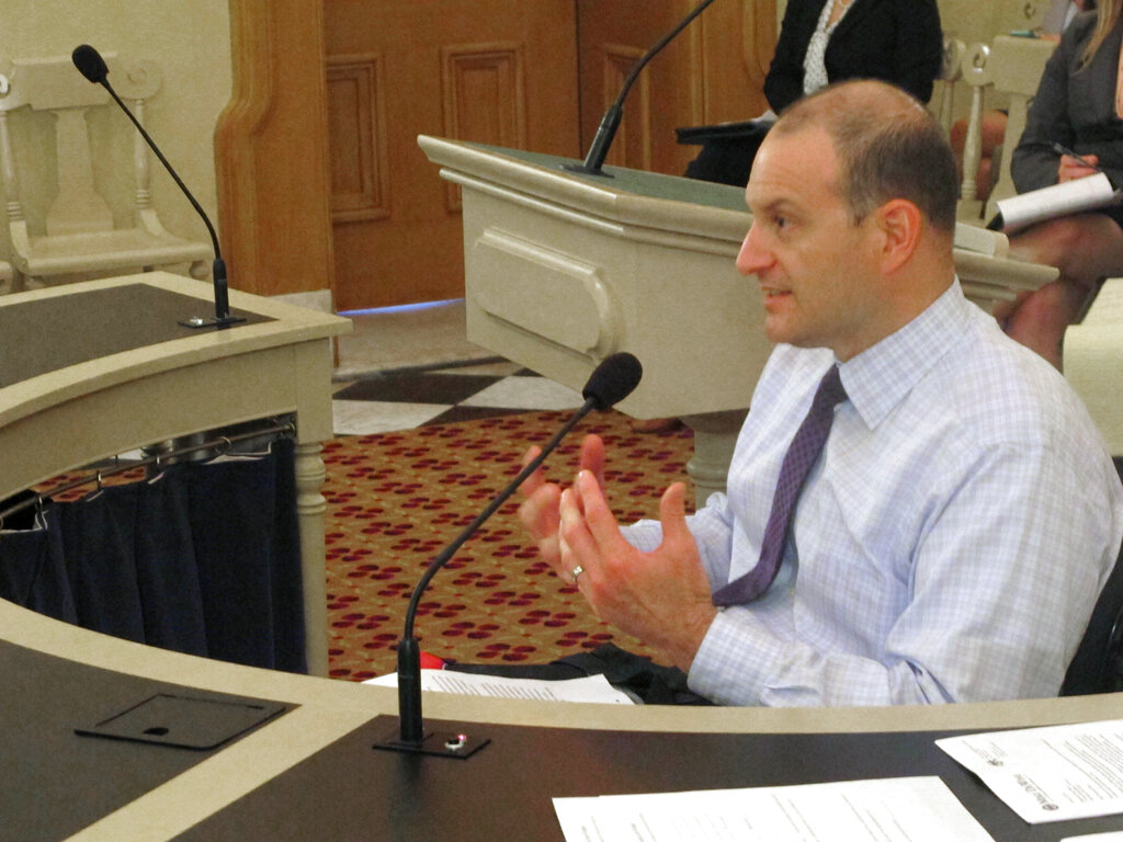 In this 2015 file photo, Mike Weinman, lobbyist for the Fraternal Order of Police of Ohio, explains his association's support for more police training and a requirement that all Ohio police officers have a high school diploma or GED, in Columbus. A proposed bill in the Ohio Senate would eliminate the requirement for a concealed weapons permit. Weinman, opposes the bill, saying, “background checks and training and the notification are absolutely necessary.”(AP Photo/Andrew Welsh-Huggins, File)