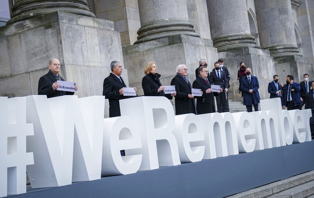 German Chancellor Olaf Scholz, Mickey Levy, speaker of the Knesset, Bärbel Bas, president of the Bundestag, German President Frank-Walter Steinmeier and Bodo Ramelow, prime minister of Thuringia and president of the Bundesrat, from left, stand in front of the Reichstag building after the memorial hour for the Day of Remembrance of the Victims of National Socialism at the lettering "#weremember" today in Berlin, Germany. (Kay Nietfeld/dpa via AP)