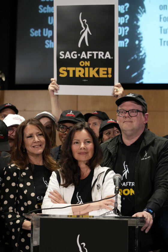 Joely Fisher, from left, SAG-AFTRA president Fran Drescher and SAG-AFTRA National Executive Director and Chief Negotiator Duncan Crabtree-Ireland attend a news conference Thursday in Los Angeles announcing a strike by The Screen Actors Guild-American Federation of Television and Radio Artists. This marks the first time since 1960 that actors and writers will picket film and television productions at the same time. (AP Photo/Chris Pizzello)
