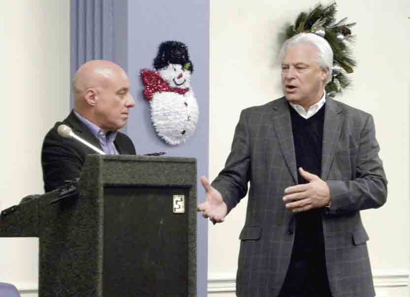 Tribune Chronicle / Jon Wysochanski Mark Cestari, chief commercial officer of Southern Airways Express, left, talks with John Moliterno, executive director of the Western Reserve Port Authority, Tuesday during a public meeting held at the Youngstown-Warren Regional Airport.