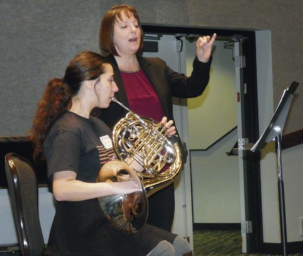 Tribune Chronicle photo / Guy Vogrin French horn player Samantha Nicholson, seated, of Niles, who is a sophomore in the YSU Dana School of Music, receives musical instruction from Gunnery Sgt. Greta Richard of the U.S. Marine Corps Band during Sunday’s Horn Workshop held in the Bliss Recital Hall at Youngstown State University.