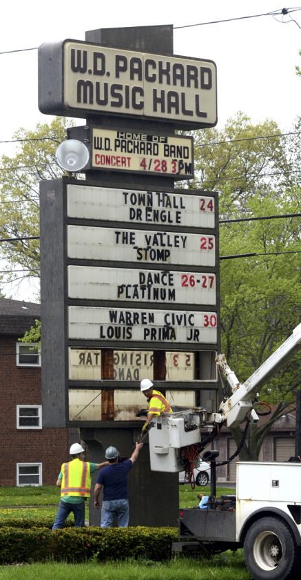 WARREN — Workers from a Pittsburgh company spent Friday evening taking down the large black letters from the iconic sign outside Packard Music Hall that was used to advertise events.