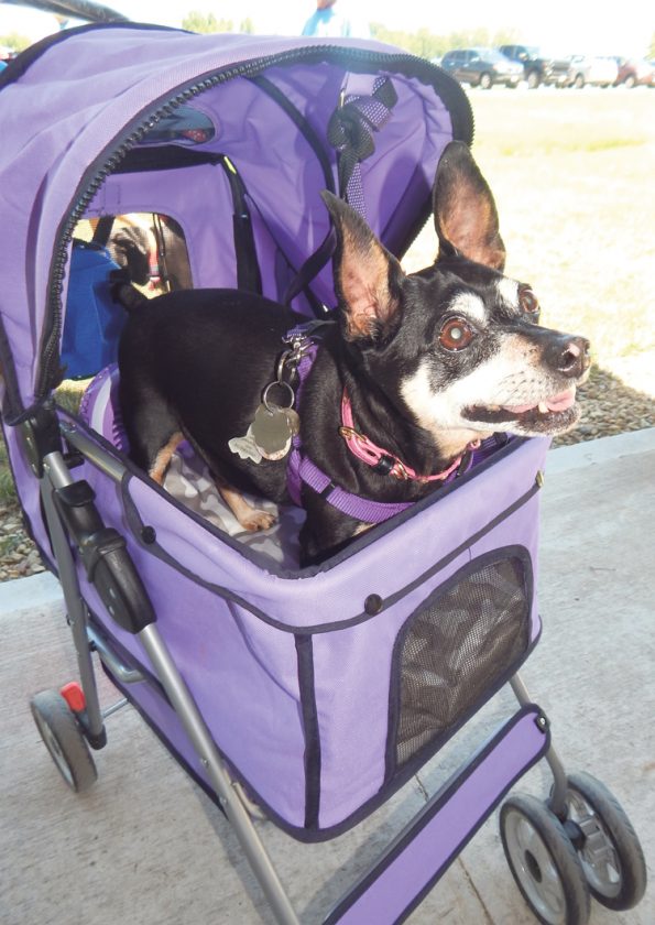 Tribune Chronicle photos / Bob Coupland Beef, a miniature Pinscher, spends time in a stroller at a celebration Sunday of the 10th anniversary of the dog park at Mosquito Lake State Park in Bazetta where dogs have been permitted for 10 years to run without leashes, play on a portion of the beach and take part in various dog-friendly activities.