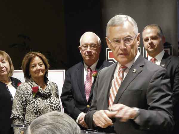 Staff photo / Raymond L. Smith Youngstown State University President Jim Tressel makes a point Wednesday during an update of the YSU Foundation’s “We See Tomorrow” campaign.