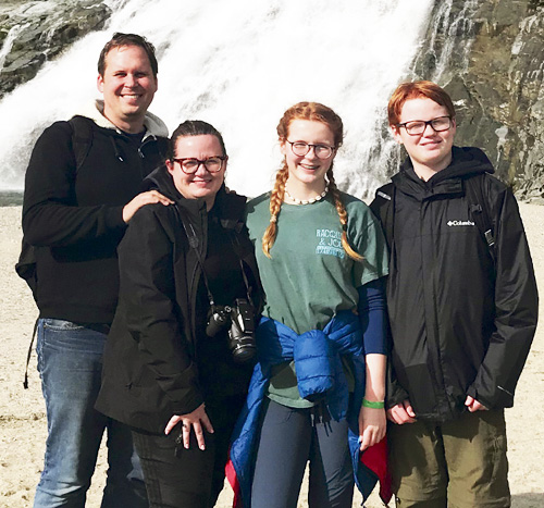Dr. Benjamin Neuman, left, a virologist at Texas A&M University, helped to develop the official name for the COVID-19 virus, SARS Coronavirus Two. Here Neuman, a Niles native, and his family visit Nugget Falls at the Mendenhall Glacier in Alaska. To his right are his wife, Nicola, and children, Theia and Isaac. (Submitted photo)