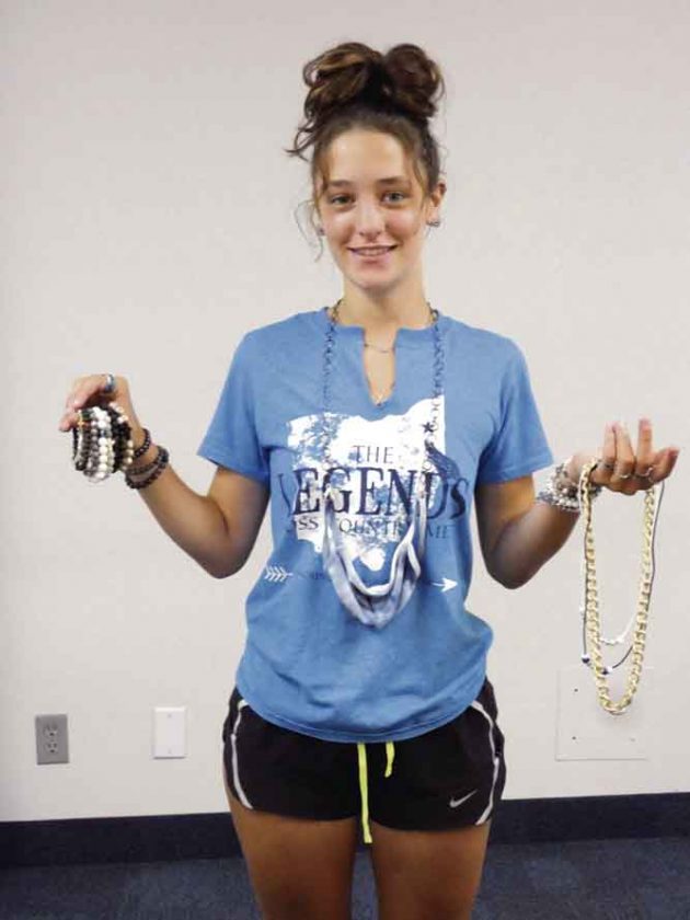 Staff photo / Burton Cole Elenie McNally displays some of the bracelets, mask holders and rings she’s created for her online store, Handmade by Elenie. The Howland graduate donates money from each sale to various needs in the area.