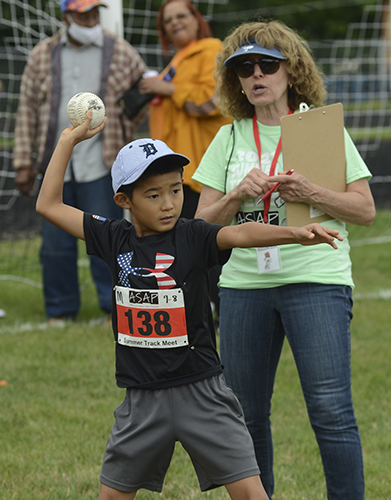 Staff photo / R. Michael Semple Shoichiro Saito, 7, of Champion, left, winds up and throws the ball as volunteer Deborah Tominey of Niles records his distance during the softball throw at the ASAP summer track meet Saturday at the Warren G. Harding Track and Field Complex.