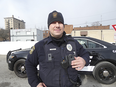 Staff photo / Raymond L. Smith Warren police officer John Murdoch shows off one of the department’s body cameras on Friday. The city has 34 of the cameras available plus three more on order as part of a package with new police cruisers.