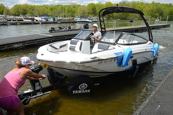 Staff photo / R. Michael Semple New boat owners Ashley Haines, left, and husband Jerry of Niles take their new Yamaha AR 195 out of the water at the Mosquito Lake State Park marina after a morning on the reservoir in Bazetta.