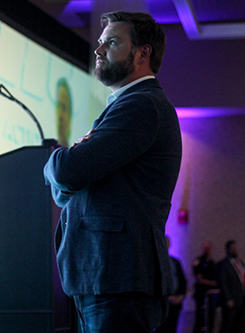 Staff photo / Allie Vugrincic J.D. Vance watches a video introducing Florida Gov. Ron DeSantis during the Turning Point Action Rally Friday night at the Metroplex in Liberty.
