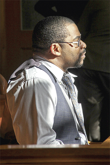 Cederick D. Patterson, 40, of Warren, facing a charge of murder, waits for the prosecution and defense to confer with Judge Ronald J. Rice during his jury trial Tuesday morning at the Trumbull County Common Pleas Court.