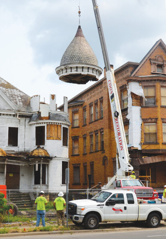 The Moorish-domed cupola from the historic Harsh House next to the Packard building along North Park Avenue NE in Warren is removed by Coon Restoration Specialists of Louisville on Tuesday. The cupola weighs approximately 6,500 pounds and has a slate roof and will be put in storage for the time being. The house was built in the 1890s, and Steven Coon plans to use the space for a parking lot for the Packard building, which he also owns and is restoring. There has been an effort in recent years to save the Harsh Home from demolition, but Coon was not willing to sell it. The three-story, wood-frame house was built for Julia M. Harsh, a descendant of one of the first families to settle in Warren.