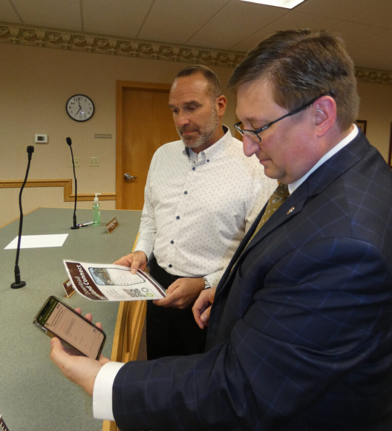 Staff photo / Bob Coupland Howland has unveiled a new mobile app to provide the public with quicker access to information on events, happenings and alerts in the township. Township Administrator James Pantalone, left, and Trustee Matt Vansuch show how to access the app on a cellphone at Wednesday’s trustee meeting.