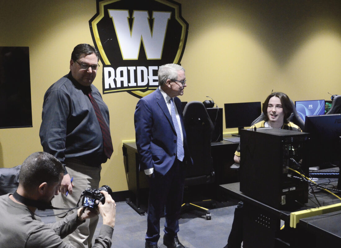 Staff photo / R. Michael Semple Ohio Gov. Mike DeWine, center, talks with Warren G. Harding High School student Austin Moore, 17, right, while touring the esports lab at the new Student Recreation & Wellness Center following the center’s ribbon cutting Monday afternoon. Also touring the lab was Warren Superintendent Steve Chiaro, left.
