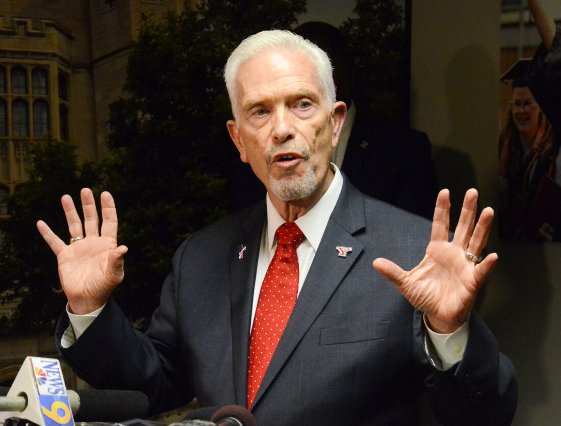 Former Congressman Bill Johnson addresses the news media regarding a firestorm created after he was tapped as the new president of Youngstown State University. [/caption]YOUNGSTOWN — The year began with controversy and turmoil at Youngstown State University after the university’s Board of Trustees hired U.S. Congressman Bill Johnson, R-Marietta, as the school’s next president, following the departure of Jim Tressel.