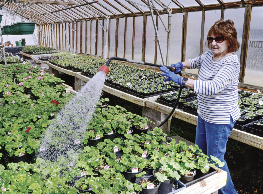 Packard Park Greenhouse Growers volunteer Jamie Taneri of Champion waters the geraniums, petunias and begonias Monday at the Packard Park greenhouse on Mahoning Avenue NW in preparation for the upcoming annual plant sale May 10 and 17. The organization formerly was known as the Friends of the Greenhouse Consortium.