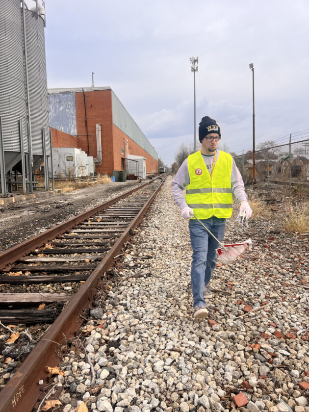 The group met in a parking lot across from a rental car place at Mahoning Avenue and Belmont Street. They then moved toward the train tracks, where most of the work happened. Volunteers picked up typical trash like aluminum cans and plastics, which they recycled. They also cleared bigger items, such as parts of car bumpers and other debris.