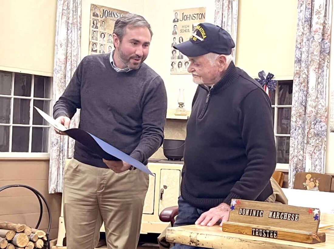 State Rep. Dave Thomas, R-Jefferson, presents a proclamation Monday from the Ohio House of Representatives to Johnston Trustee Dominic Marchese for his 24 years of service as a township trustee. Thomas is Marchese’s grandson and attended Marchese’s final trustees meeting Monday. The township trustees also recognized Marchese for his service.