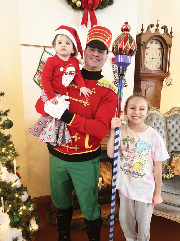 Staff photo / Bob Coupland Jeff Ford, a member of the Vienna Historical Society, dressed as toy soldier for Christmas, visits with Iris Maras, 15 months, being held, and Aurora Maras, 9, of Vienna, Sunday at the Vienna Christmas celebration. The public could visit different locations at the township center with holiday events, including churches and the historical society.