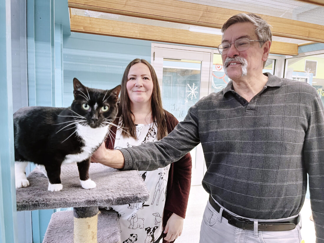 Staff photo / Bob Coupland Dan Csontos, president of the Animal Welfare League’s 11-member board, and Bethany Cluckey, Animal Welfare League chief executive officer, show one of the cats available for adoption. Plans are being made for fundraising and other events to generate money for operation of the humane agency, which has seen an increase in animal humane calls and hoarding situations with animals.